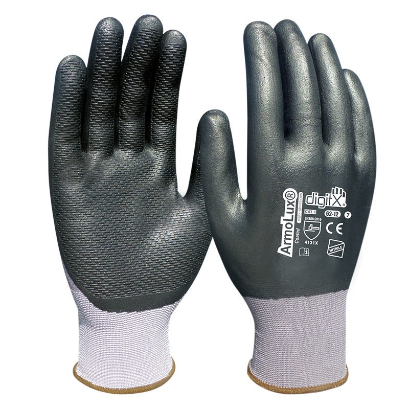 - Fully coated foamed nitrile glove on palm and back.